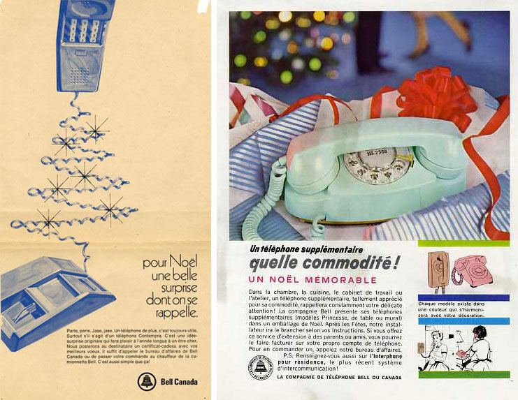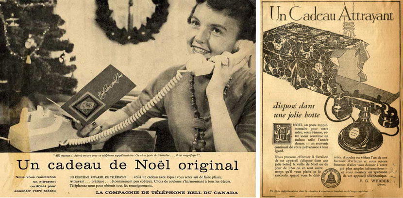 D’anciennes publicités des Fêtes de Bell font la promotion des appareils téléphoniques supplémentaires : leur utilité, leur commodité et la variété de modèles et de couleurs. Les publicités du début du vingtième siècle présentent le téléphone comme un cadeau pratique et original pour vos êtres chers.