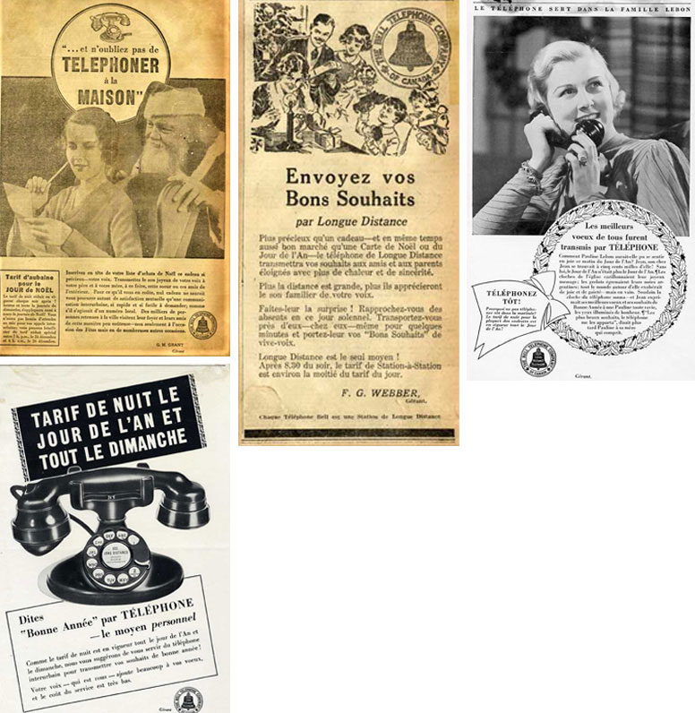 Bell ne manque pas une occasion de rappeler l’importance du protocole téléphonique à ses clients afin d’assurer le bon déroulement de leurs appels durant les Fêtes. Comme le soulignent les publicités ci-dessous, on suggère de passer un appel avant ou après les heures de pointe pour les appels interurbains et de donner le numéro de téléphone exact à la téléphoniste. Les publicités en temps de guerre encouragent les Canadiens à maintenir leurs lignes téléphoniques libres pour les urgences et pour que les militaires en service actif puissent communiquer avec leurs familles pour leur souhaiter de joyeuses Fêtes.
