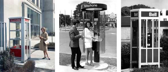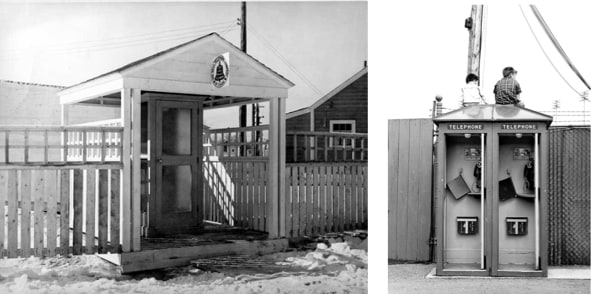 As a result, the outdoor telephone booth, already popular in the United Kingdom, makes its Canadian debut in June 1944. These are makeshift, indoor booths enclosed in specially constructed shelters. But what had begun as an emergency measure proved so successful that, by 1945, the outdoor telephone booth became a permanent feature on the landscape.