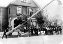 A Bell crew raising a 60-foot telephone pole near the corner of King and Dufferin Streets, Toronto, 1895