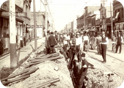 A Bell construction team laying underground cable on Queen Street, Sault-Ste-Marie, 1909
