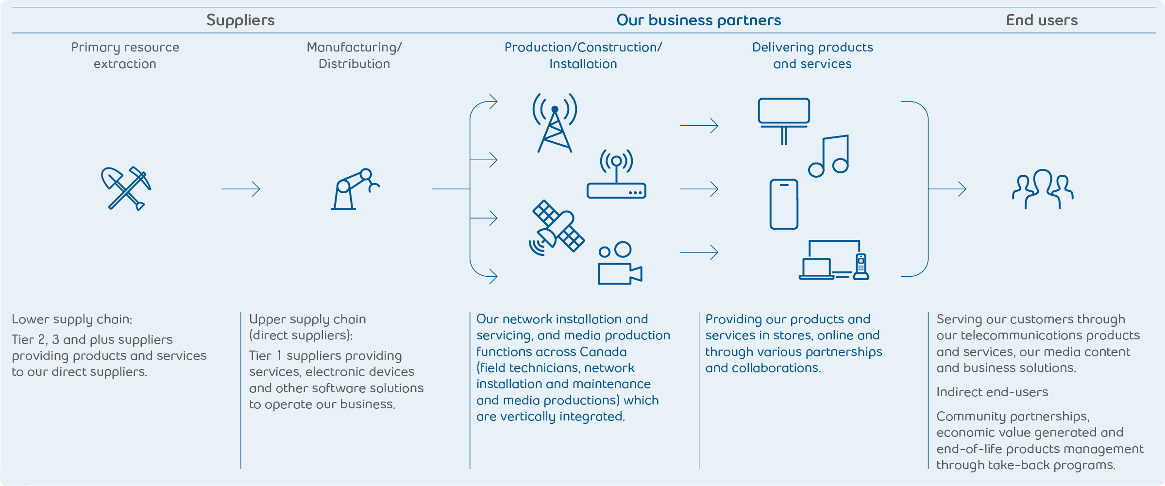 Having a clear view of a company’s entire value chain is increasingly important in responsible business practice. At Bell, we seek to continually expand and simultaneously deepen our knowledge of the people and issues in our value chain. While our operations and influence are primarily based in Canada, we join industry peers and companies from other industries in global working groups.